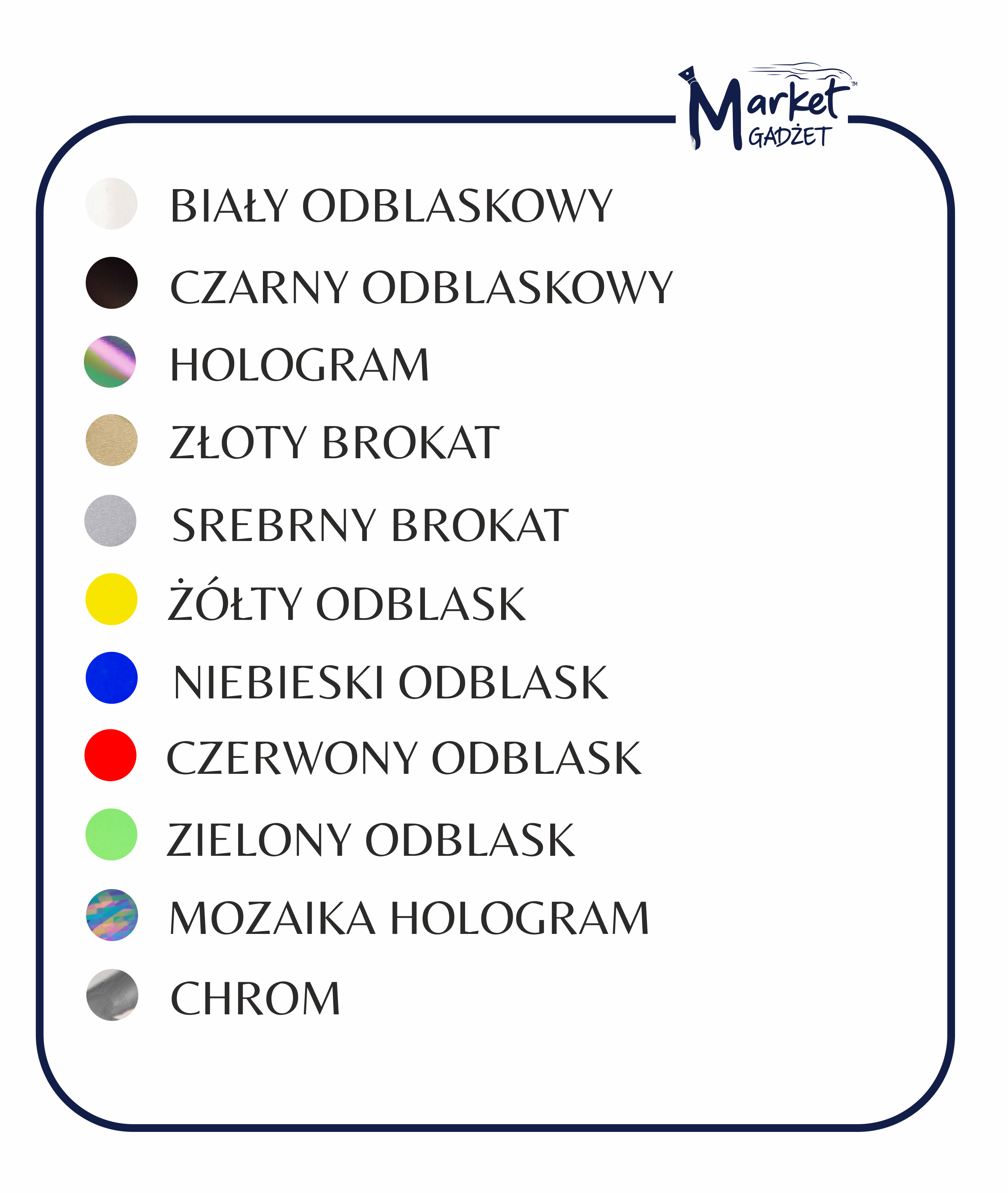 Kolor: BIAŁY/ ODBLASKOWY - taki jak na miniaturce aukcji lub wybrany z palety kolorów, która jest dostępna na ostatnim zdjęciu